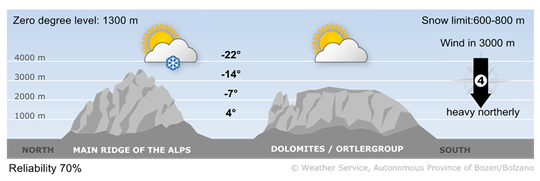 Winds at high altitudes will be easterly. A Föhn wind will blow on the southern side of the Alps.